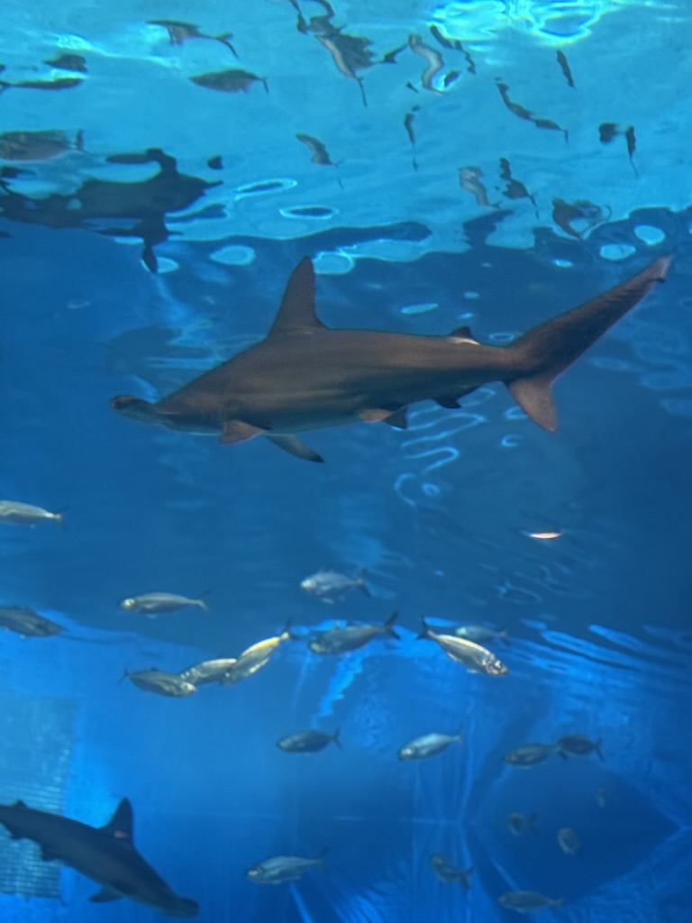 수조 안에는 호랑이상어, 실버팁상어, 실키상어, 망치상어가 유영하고 있습니다.