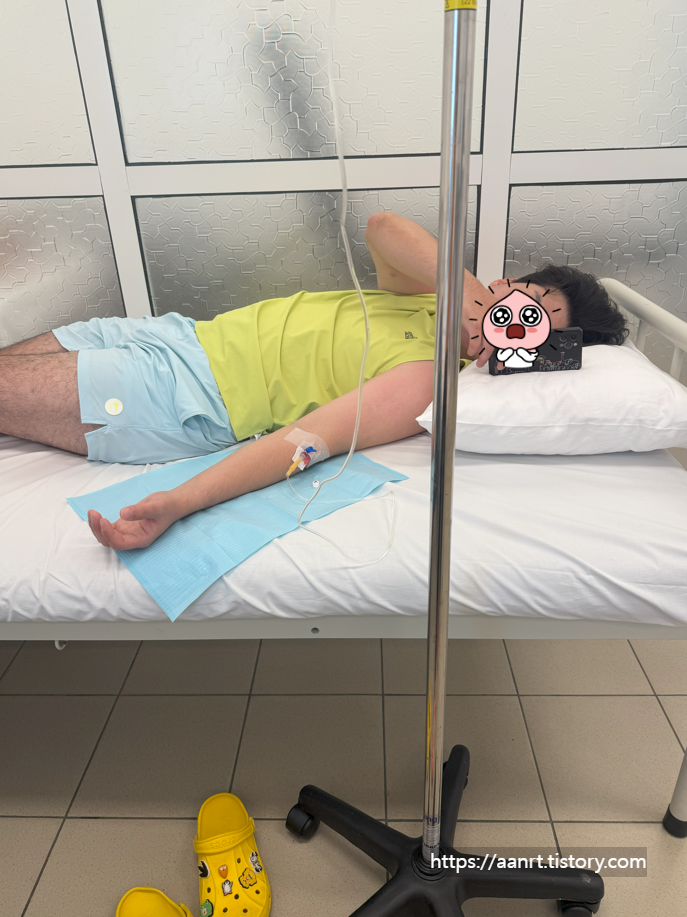 그리고 체크아웃하는 마지막 날, 와이프의 상태가 좋지 않아 바로 병원 치료를 결정했습니다. 너무 힘들어하고 복통이 심해 울기까지 하는 모습을 보니 마음이 아팠지만, 저는 평소 강하게 키우는 스타일이라 바로 링겔을 맞으라고 했습니다.