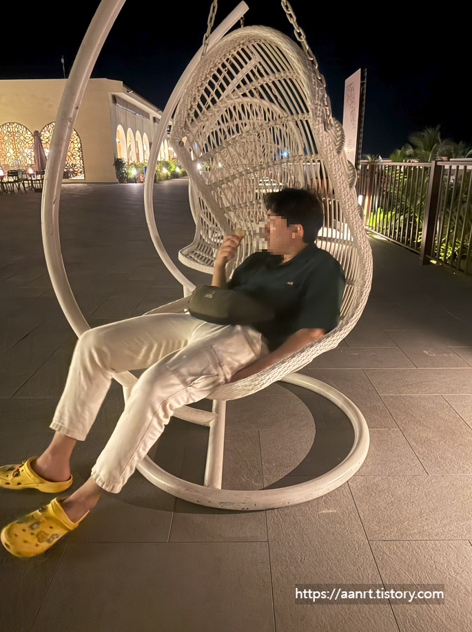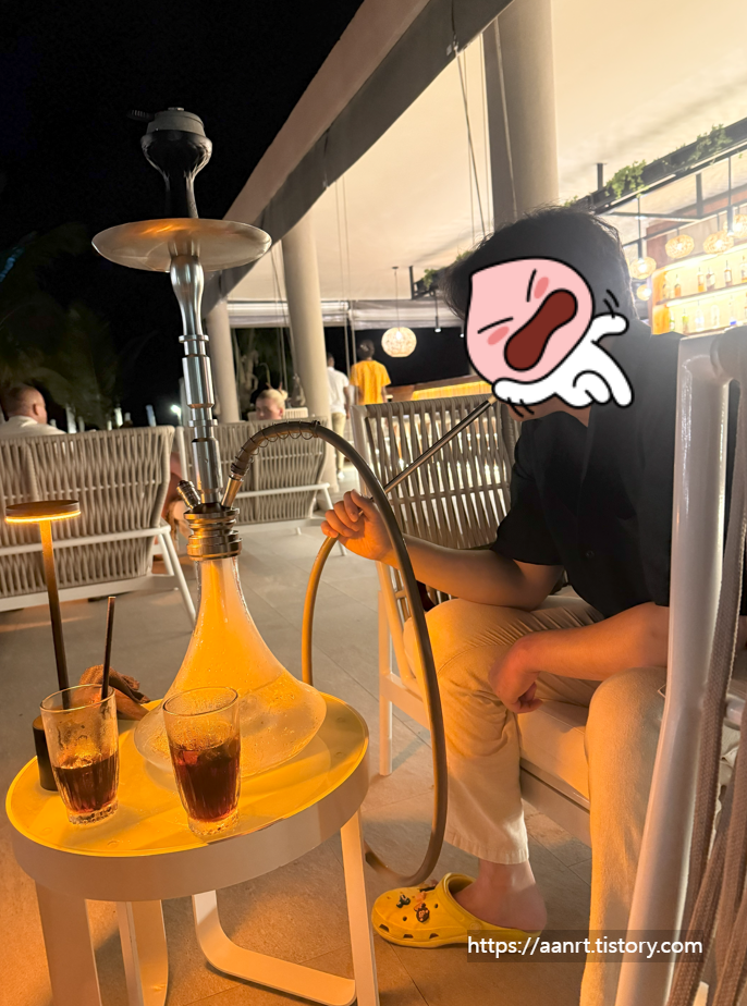 야밤에 풀바에서 콜라와 물담배(후카)를 즐기게 되었습니다. 물담배는 평소 저희가 피는 아이코스보다는 연하고 부드러웠지만, 여행 와서 한 번쯤 경험해보기에 좋았습니다. 향이나 강도도 강하지 않아 부담 없이 즐길 수 있었고, 별도 요금이므로 체크아웃 시 결제하면 됩니다.
